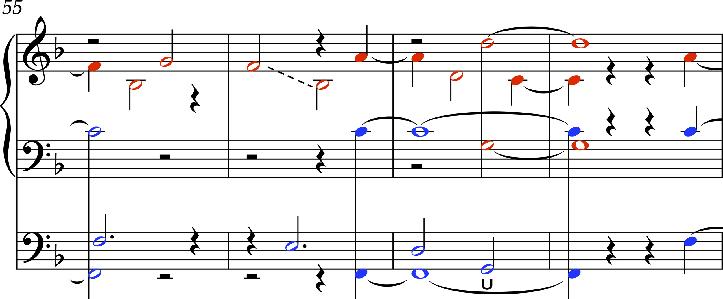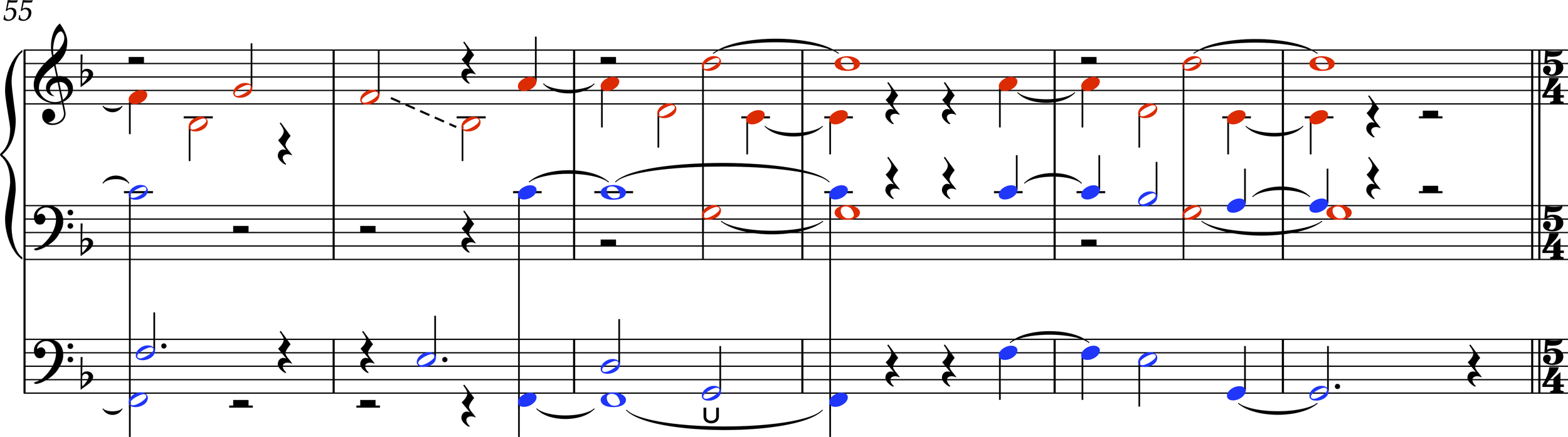 In the solo organ version, the two intertwining canonic layers take different timbres, and are color-coded in the score. In the version for two organs, these layers are divided between the two instruments.