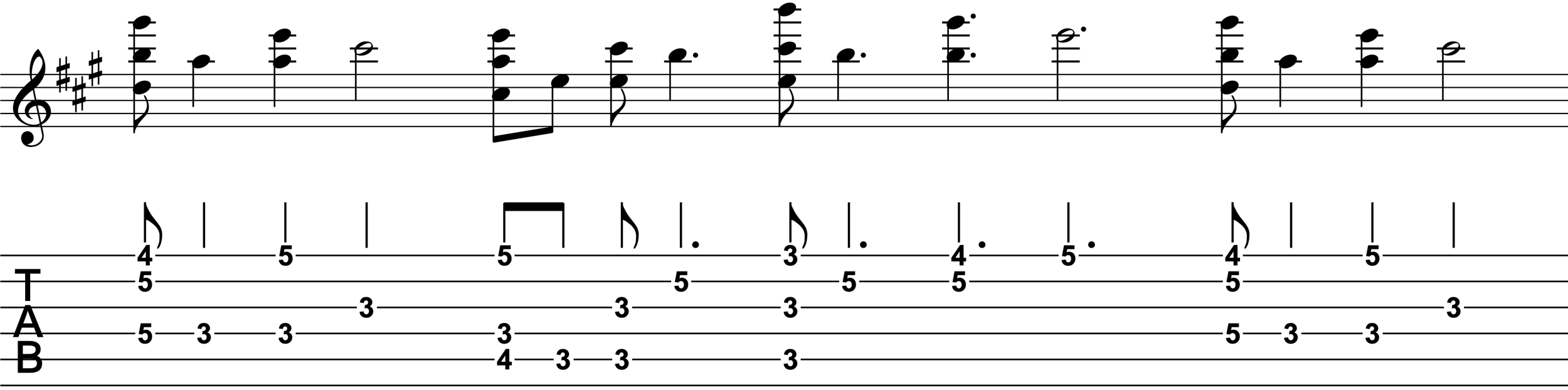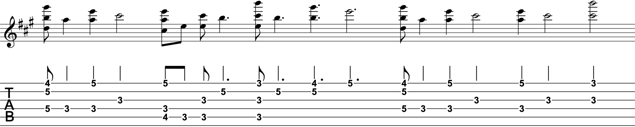 Played entirely on the 3rd, 4th, and 5th natural harmonics. Score is given in tablature.
